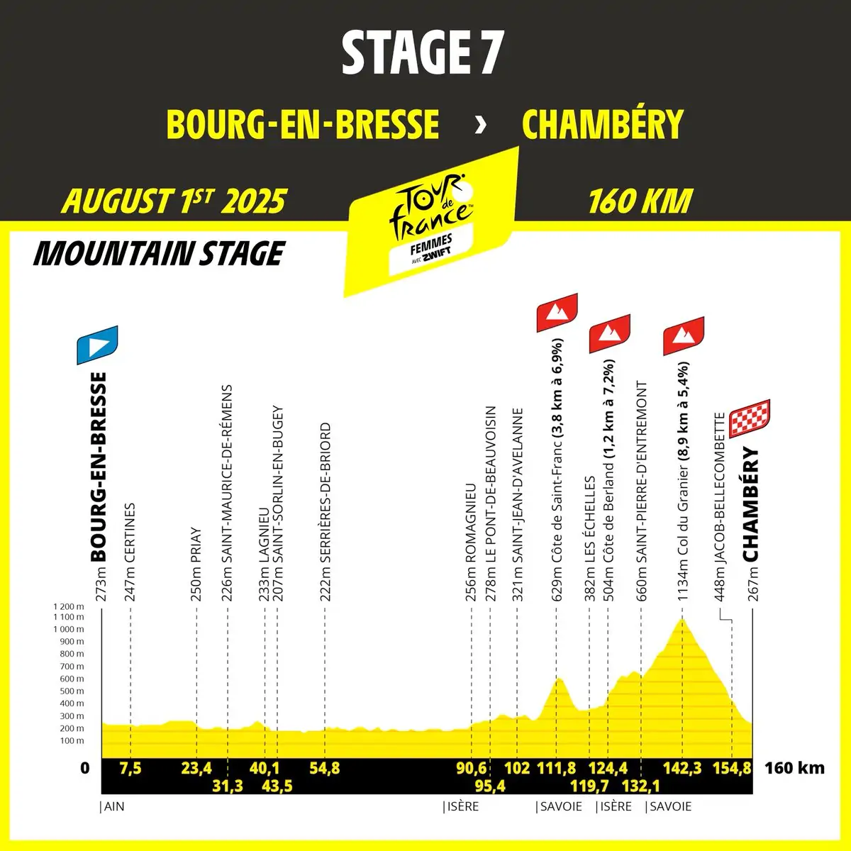 Desde el magnífico monasterio de Brou, la carrera discurrirá por carreteras llanas, en el límite de Dombes y la llanura de Ain. Los competidores se acercarán a la cascada de Glandieu antes de verse frenados, más adelante, por la costa de Saint-Franc. Luego, por Les Échelles y las gargantas de Guiers Vif, llegarán al Col du Granier (8,9 km al 5,4%). El salto hacia la meta, juzgado frente al estadio de Chambéry Savoie, promete ser rápido y técnico.
