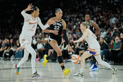 A’ja Wilson penetra hacia canasta ante DeWanna Bonner y Sami Whitcomb, en el partido definitivo de la final de la WNBA.John Locher (AP)