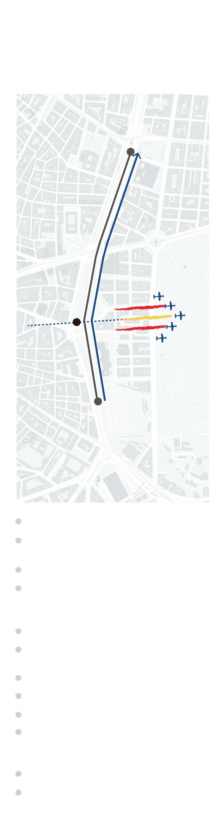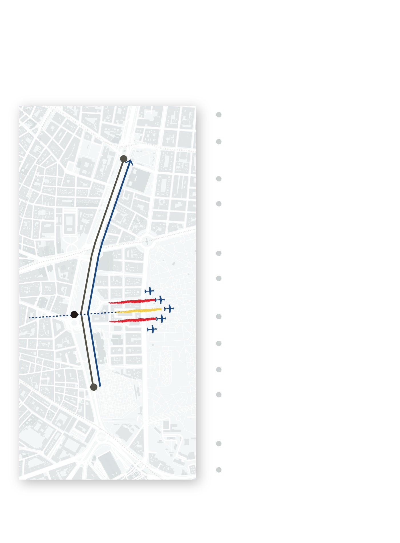 El desfile aéreo entrará en la capital desde el sur y sobrevolará la zona del desfile terrestre hacia el norte. Por su parte, la Formación Mirlo, que este año sustituye a la Patrulla Águila, pasará la zona de Cánovas del Castillo en un vuelo transversal al resto del desfile.