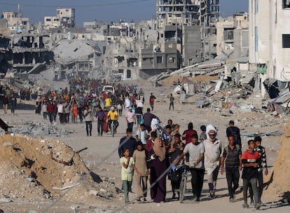 Palestinos caminan entre escombros, en Khan Younis, al sur de la Franja de Gaza el 11 de octubre.Ramadan Abed (REUTERS)