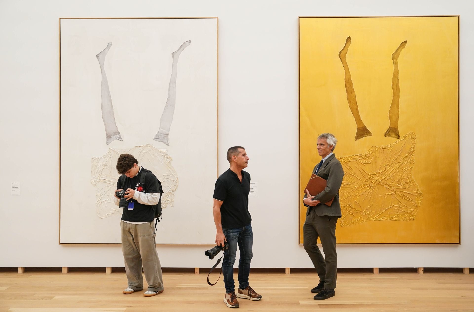 Los enormes lienzos (algunos de hasta casi cinco metros de alto por tres de ancho) abordan los temas que obsesionan al artista con imágenes impregnadas por la conciencia del cuerpo humano –casi siempre el suyo y el de su esposa, Elke–, su propia autobiografía y la historia del arte. «Figuras, manos, medias de nylon, piernas, pies y águilas imperiales condensan una nueva expresividad y la genial lucidez de su producción más reciente», explicó el director. Entre todas, una pintura de 2024 de cuatro metros y medio de ancho por tres de alto muestra un aguila imperial con medias y las alas abiertas cayendo (boca abajo), un símbolo de la heráldica alemana que ya usó en los 70; la titula con ironía ‘No puedo tener sexo’. «Pero básicamente –prosiguió Rosenthal–, se pinta a él y a su mujer. En los cuadros se les ve duplicados, allí está Elke pintada cinco veces con medias de nylon reales, que coloca a modo de collage, y que pueden resultar un poco sórdidas o simplemente parecer un recuerdo. ¡Mi propia madre las llevaba!».