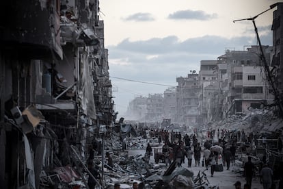 Las imágenes del retorno masivo causan una mezcla de esperanza y desolación. La multitud avanza en medio de un escenario de película apocalíptica: el ejército de Israel ha dañado o destruido el 90% de edificios de Gaza en bombardeos, demoliciones masivas y explosiones controladas, según la ONU.