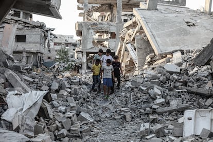 Niños caminan entre los escombros de edificios destruidos por las bombas en Deir el Balah, este sábado. Anadolu (Anadolu via Getty Images)