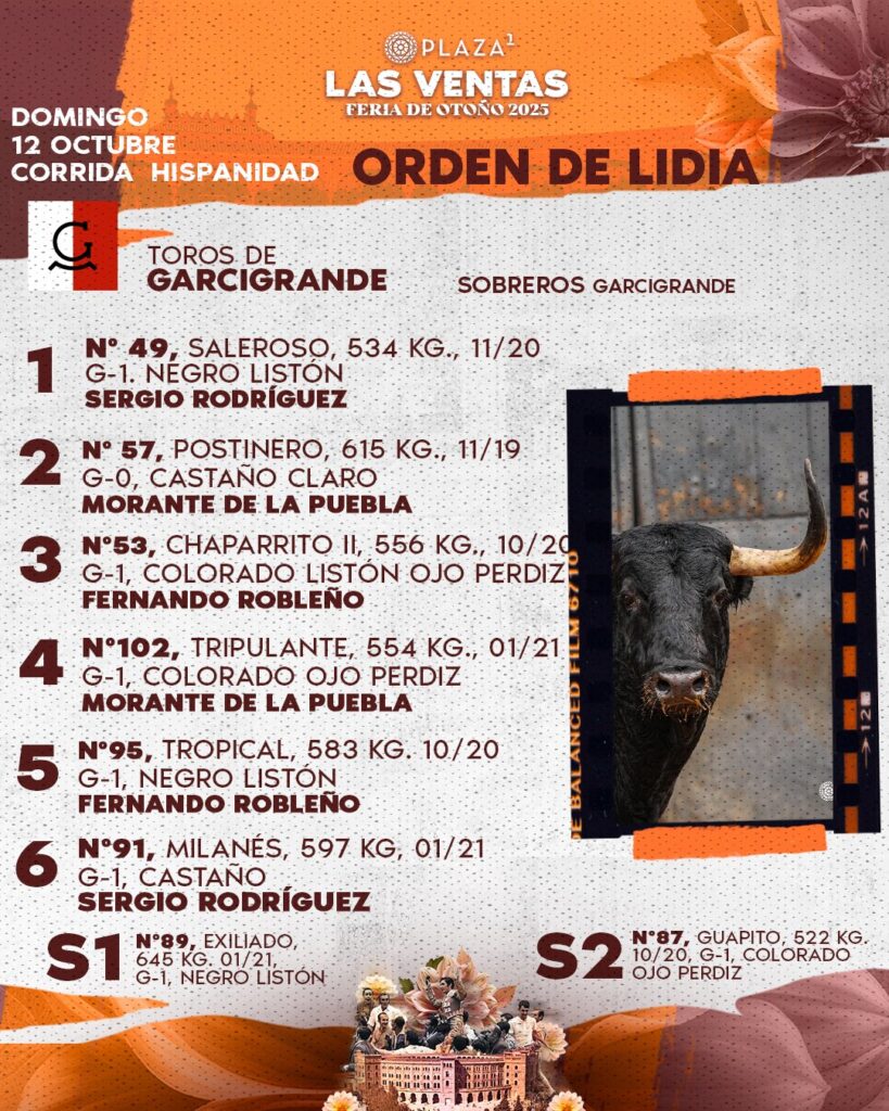 Sorteados y enchiquerados los Toros de Garcigrande para la corrida de la Hispanidad2025 que viviremos a partir de las 18h. en LasVentas