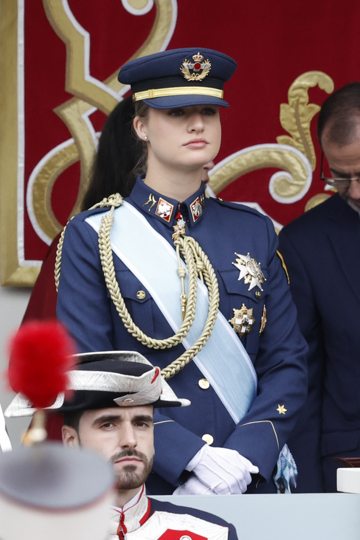 El 12 de octubre de 2023 se ausentó la infanta Sofía, al igual que en 2024 y por el mismo motivo que su hermana. Pero además de eso, Leonor se enfundó por primera vez un uniforme militar, el de gala como cadete del Ejército de Tierra. La princesa de Asturias, que había jurado bandera tan solo cinco días antes, pensó que era lo más adecuado y apostó por el uniforme militar al haber comenzado su formación castrense.