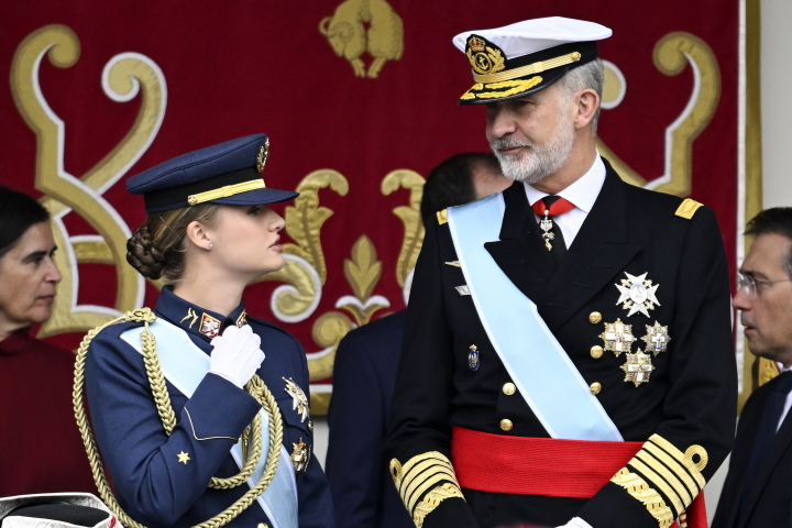 La princesa Leonor y Felipe VI hablando en el desfile militar del 12 de octubre de 2025.Getty Images