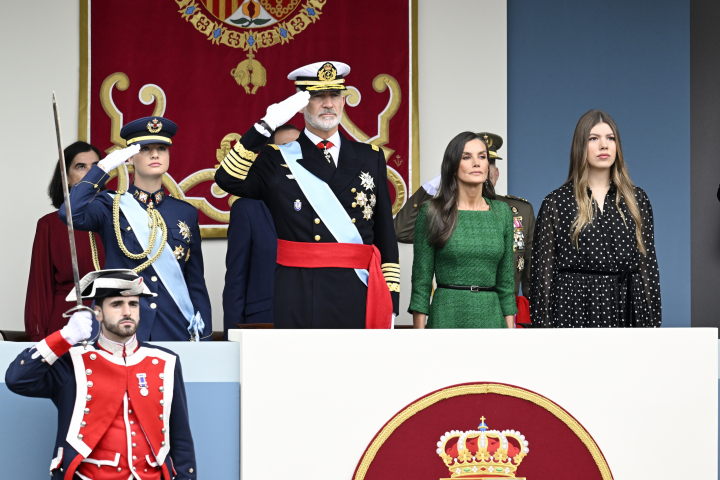 Los reyes Felipe y Letizia, la princesa Leonor y la infanta Sofía en el desfile militar del 12 de octubre de 2025.Getty Images