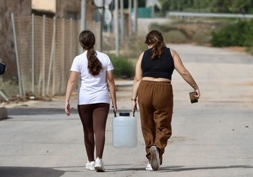 Un camión cisterna reparte agua potable a los vecinos de Dolores de Pacheco (Torre Pacheco), esta mañana.