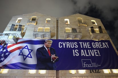 Pancarta en un edificio de Jerusalén para dar la bienvenida a Trump an Israel, en la madrugada de este domingo.ABIR SULTAN (EFE)