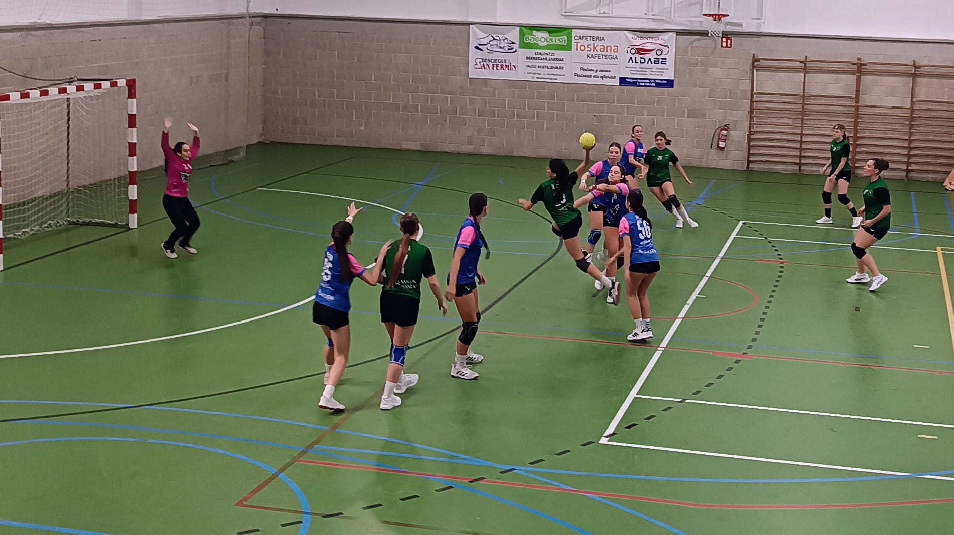 El pabellón Elizgibela de Burlada acogía este pasado fin de semana el segundo enfrentamiento entre Malkaitz y San Juan en menos de un mes, partido que las de Donibane volvían a ganar cómodamente. Y eso que las verdes no entraron con buen pie en el partido, siendo el primer parcial favorable a las locales, con un 3 – 2 a los cinco minutos de juego. Sin embargo, a partir de ahí la defensa 5 – 1 de San Juan empezó a funcionar, a presionar intensamente y haciendo que las de Burlada erraran multitud de pases, que en contraataque o en estático eran convertidos por San Juan. Eso posibilitó un parcial de 0 – 6 para las visitantes poniendo el marcador con la primera ventaja importante del partido (3 – 8 min 11). Así iba a seguir la primera parte, con las verdes fuertes en defensa y con una contundencia en ataque que fue el detonante para abrir diferencias ya casi definitivas. Al descanso se llegó con un abultado marcador de 8 – 21.