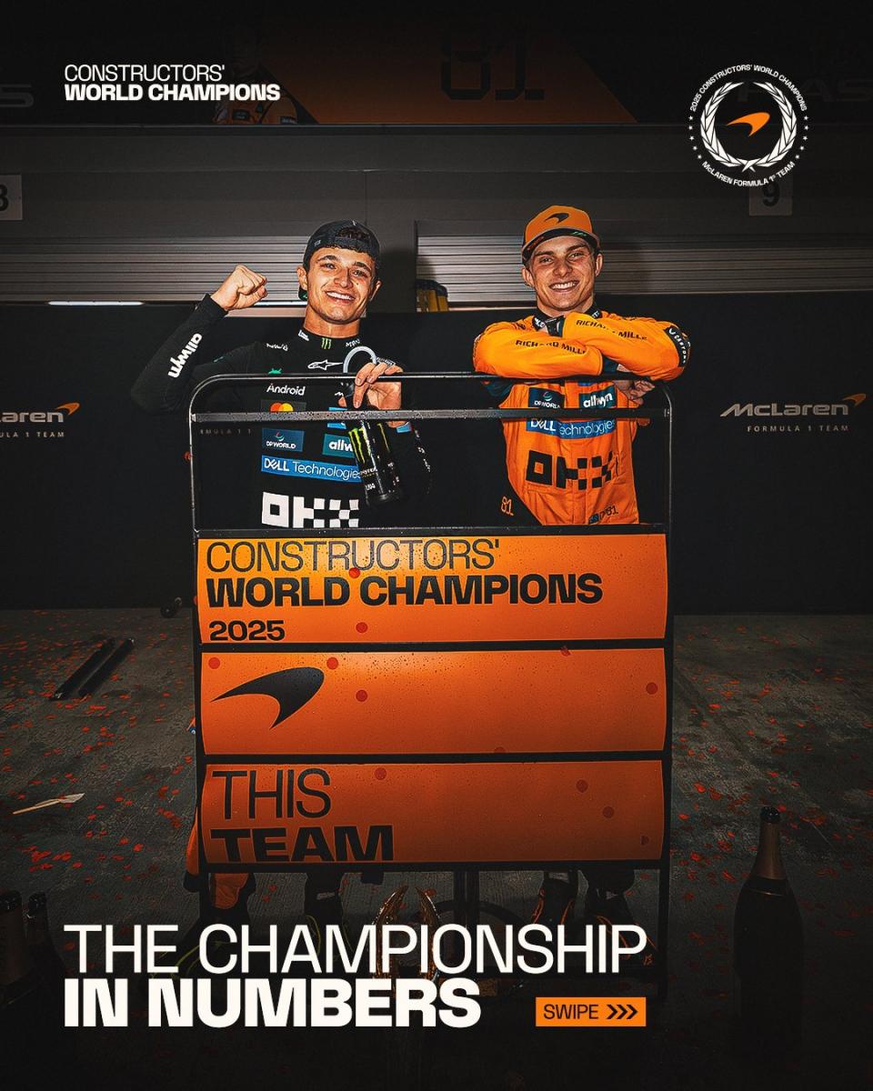 La notable superioridad vivida carrera tras carrera de Piastri y Norris sobre los demás 18 pilotos de la parrilla ha tenido su recompensa: campeones del Mundial de Constructores en el GP de Singapur, a falta de aún varios grandes premios para conocer el campeón del Mundial de Pilotos que, si nada cambia, también vestirá de color ‘papaya’.
