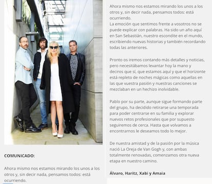 Comunicado de La Oreja de Van Gogh, publicado este miércoles.