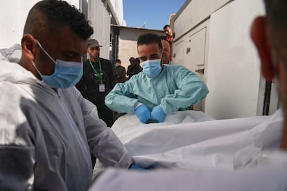 Llegada de cadáveres de palestinos al Hospital Nasser de Jan Yunis, en el sur de Gaza, en vehículos de la Cruz Roja, este miércoles.Jehad Alshrafi (AP)