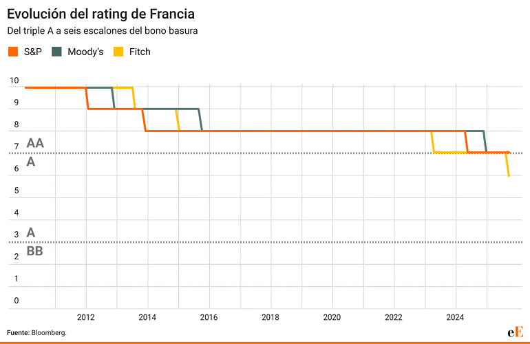 Actualmente, los rendimientos de los bonos franceses cotizan casi al mismo nivel que los italianos, pese a que Francia conserva una nota más alta, lo que sugiere que el mercado ya descuenta parcialmente nuevas rebajas. Aun así, incluso si pierde su doble A, el país seguiría dentro del grado de inversión, umbral común en la mayoría de los fondos de bonos. Se considera peligroso cuando se pierde el grado de inversión y se entra en territorio de bono basura.