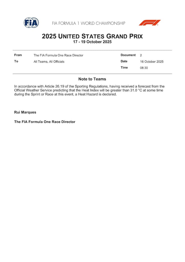 La Fórmula 1 y concretamente el Gran Premio de Estados Unidos se encuentran en alerta. Las altas temperaturas, concretamente más de 30 grados que se prevén en Austin (Texas), han obligado a la FIA (Federación Internacional del Automóvil) a decretar la alerta por calor extremo. Una condición que obligará a los equipos a instalar el sistema de refrigeración, mientras que el uso del chaleco refrigerante por parte de los pilotos será opcional.