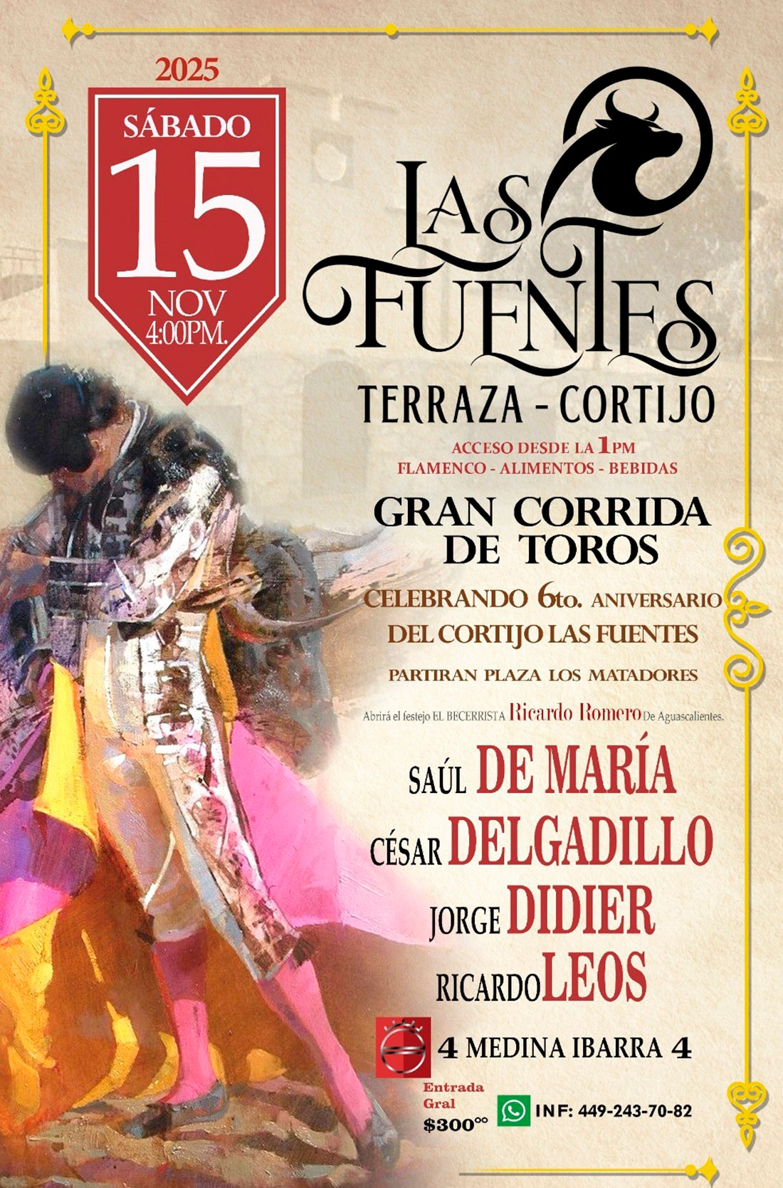 La mañana de este jueves 16 de octubre de 2025, en las instalaciones del feudo del reconocido chef torero Manolo Ayala, el Cortijo “Sevilla”, ubicado en la zona centro-sur de la ciudad de Aguascalientes, en rueda de prensa, fue presentado el cartel para la corrida de toros mixta que se dará el próximo sábado 15 de noviembre y con la que se celebrará el VI aniversario de la Terraza Cortijo “Las Fuentes” de Valladolid, localidad situada en el municipio acalitense de Jesús María.