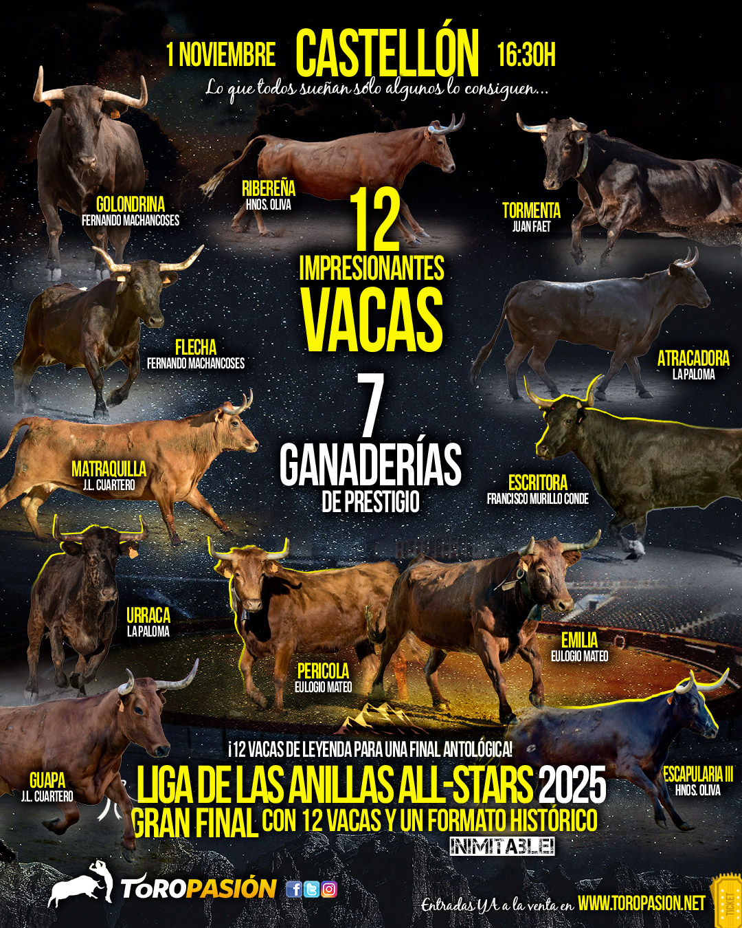 Doce vacas legendarias y siete ganaderías de prestigio protagonizarán una final antológica. La emoción de las anillas alcanzará su punto más alto en una cita donde cada detalle contará para coronar a las parejas más precisas y valientes del circuito.