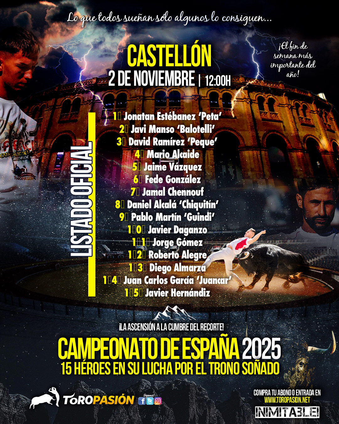 El sábado 2 de noviembre será el turno del evento más esperado del año: la Gran Final del Campeonato de España de Recortadores 2025, una cita que reúne a los mejores especialistas del país en una lucha cuerpo a cuerpo por el título nacional. Solo los más valientes lograrán escribir su nombre en la historia.