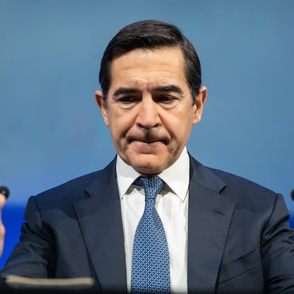 El presidente de BBVA, Carlos Torres Vila, durante una rueda de prensa, en el Auditorio Ciudad BBVA, a 30 de enero de 2025, en Madrid (España). BBVA cerró 2024 con un beneficio neto de 10.054 millones de euros, un 25,4% más en euros corrientes que en 2023, en un año marcado por la OPA que quiere lanzar sobre Banco Sabadell. Según ha informado la entidad a la Comisión Nacional del Mercado de Valores (CNMV), el margen de intereses avanzó un 9,4% en euros corrientes, hasta un récord de 25.267 millones de euros, mientras que el margen neto aumentó un 23,5% alcanzando los 21.288 millones de euros. De esta forma, el incremento del margen bruto del 20,1% cerrando en 35.481 millones de euros.