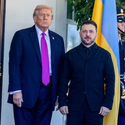 WASHINGTON (United States), 17/10/2025.- US President Donald Trump (L) greets Ukrainian President Volodymyr Zelensky as he arrives at the West Wing of the White House in Washington, DC, USA, 17 October 2025. The leaders are scheduled for a working lunch in the Cabinet Room, where President Zelensky is expected to request long-range missiles as part of an arms package. (Ucrania) EFE/EPA/SHAWN THEW