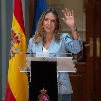 La portavoz del PP en el Senado, Alicia García, durante una rueda de prensa, en el Senado, a 16 de octubre de 2025, en Madrid (España). García ha anunciado que la comparecencia del presidente del Gobierno en la comisión de investigación sobre todas las ramificaciones del ‘caso Koldo’ se producirá el jueves 30 de octubre a las 09:00 horas, un día después del funeral de Estado por las víctimas de la dana.