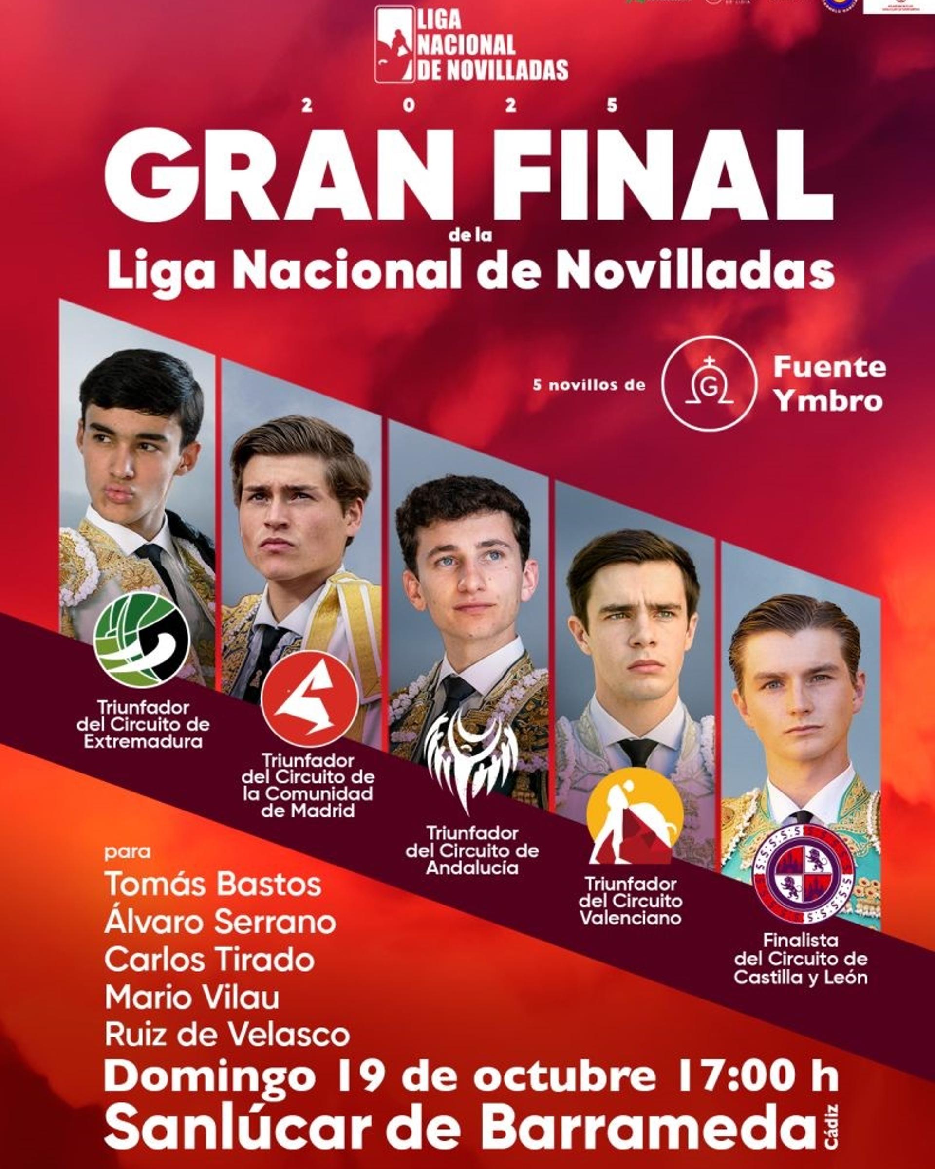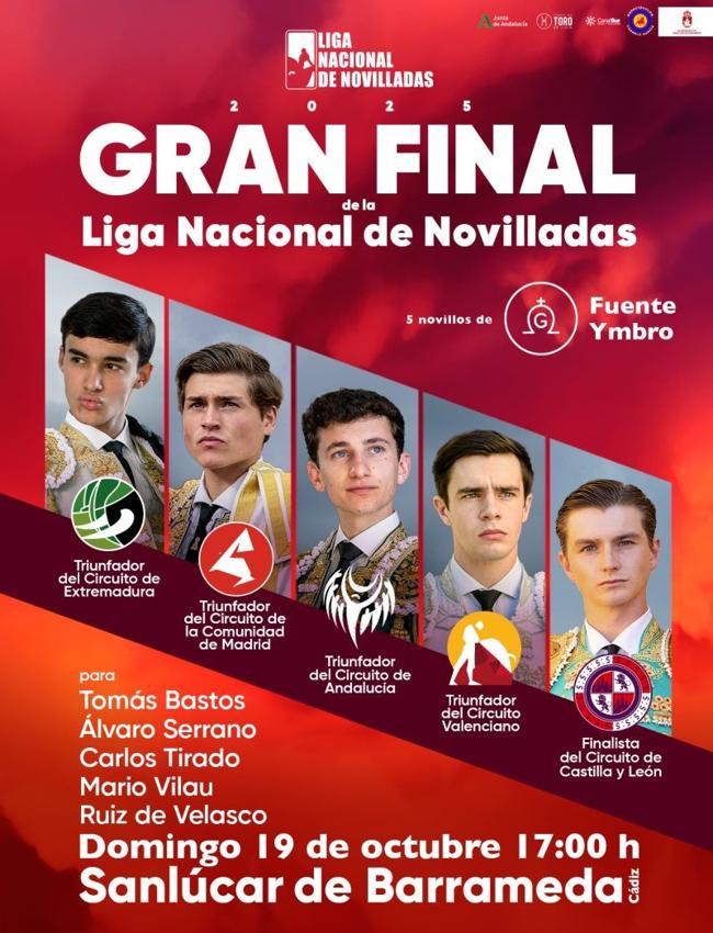 La gran final de la Liga Nacional de Novilladas 2025 se celebra este domingo 19 de octubre desde la plaza de toros de Sanlúcar de Barrameda. Un festejo que comenzará a las 17:00 horas con novillos del hierro de Fuente Ymbro y en el que harán el paseíllo los triunfadores de los distintos circuitos que participan en el certamen.
