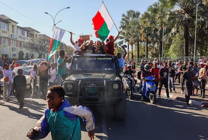 Jóvenes que celebran la participación de los militares en las protestas contra el presidente de Madagascar, el 14 de octubre en Antananarivo.Siphiwe Sibeko (REUTERS)