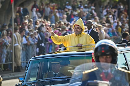 Mohamed VI saluda al público que flanquea su vehículo de camino al Parlamento en Rabat, el 10 de octubre. Moroccan Royal Palace (via REUTERS)