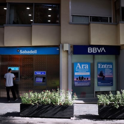 GRAFCAT3027. BARCELONA, 10/10/2025.- Vista de una oficina del Banco Sabadell junto a otra del BBVA en una calle de Barcelona este viernes cuando los accionistas del Banco Sabadell tienen de plazo hasta esta medianoche para decidir si aceptan el canje de acciones planteado por el BBVA en su intento de tomar el control de la entidad catalana. EFE/Alberto Estévez