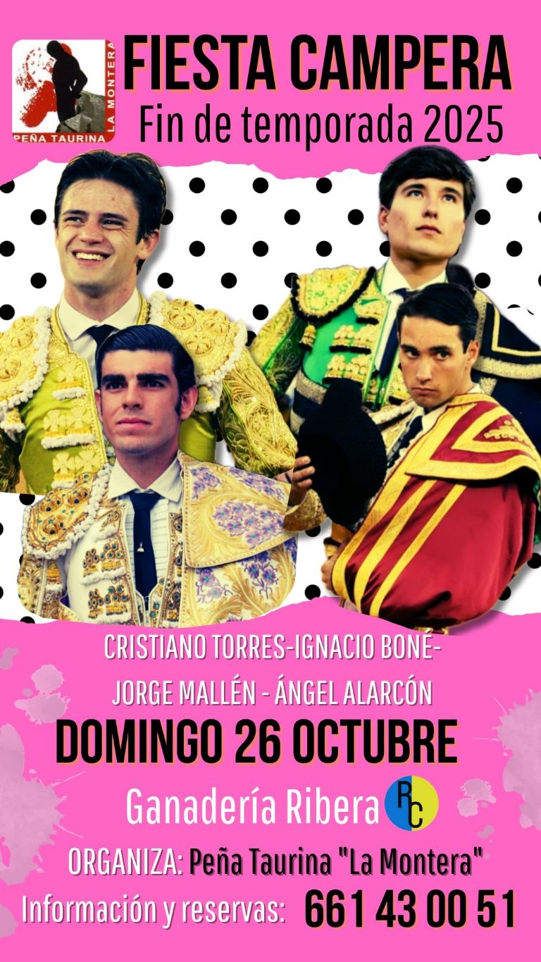 La veterana Peña Taurina La Montera de Zaragoza celebrará el próximo domingo, 26 de octubre, su tradicional fiesta campera de fin de temporada. El encuentro tendrá lugar en la ganadería de Ribera, en Pina de Ebro, y contará con la presencia del matador de toros Cristiano Torres y los novilleros Ignacio Boné, Jorge Mallén y Ángel Alarcón, en sus respectivas categorías con y sin caballos.