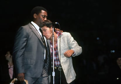 El saxofonista Clarence Clemons consuela a Springsteen durante un concierto en Detroit, en octubre de 1980. Icon and Image (Getty Images)