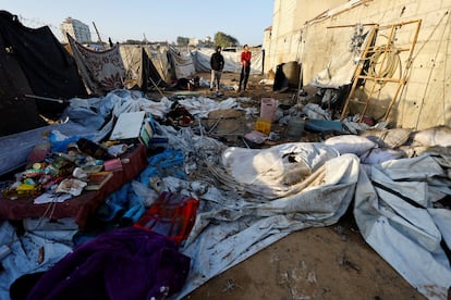 Lugar de uno de los bombardeos israelíes el domingo, en una tienda de campaña de desplazados en Nuseirat, en el centro de Gaza, este lunes.Mahmoud Issa (REUTERS)