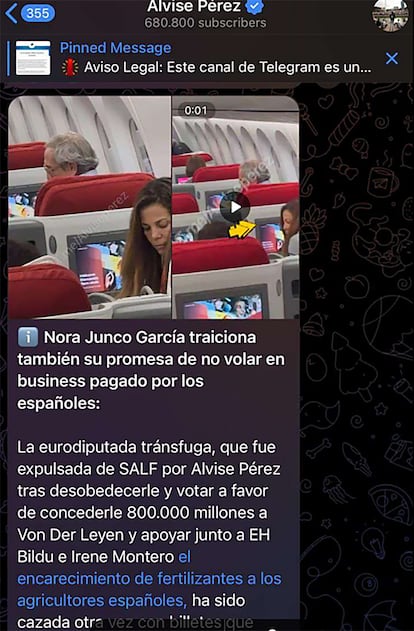 Alvise advierte en su canal de Telegram que Nora Junco viaja en primera clase