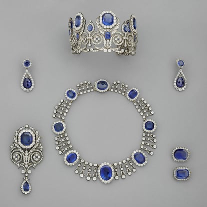 - Un collar y dos pendientes de zafiro. Ambas monarcas lucen esas joyas ahora desaparecidas en muchos de los retratos de la época.