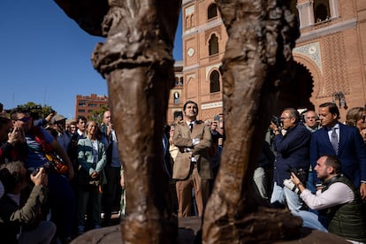 Morante de la Puebla, en el centro, el pasado 11 de octubre en la inauguración de la estatua de Antoñete frente a la puerta grande de Las Ventas.
