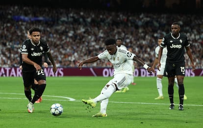 El Real Madrid deshizo el apretado nudo de la Juventus con un gol antiguo. Antiguo de hace nada, en realidad, aunque ha parecido mucho. Vinicius se inventó un espacio en el área a base de regates, rodeado, solo, independiente, y tiró al palo, adonde acudió a la cita como antiguamente Jude Bellingham, con un tanto como los del principio, cuando solucionaba todos los agobios por pocos segundos que le quedaran al cronómetro. Entre la magia de Vinicius, el pequeño regreso del inglés y las paradas de Courtois, el Madrid sumó su tercera victoria seguida en la Champions, esta ante una Juventus muy solidaria y que terminó acosando la portería del belga. Al Real, espeso y sin muchas ideas, le costó superar el trago, pero enfila el Clásico del domingo invicto en la Copa de Europa y aún líder de la Liga.