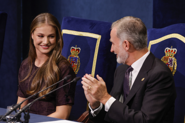 El rey Felipe VI aplaude a la princesa Leonor tras su discurso en los Premios Princesa de Asturias 2025 en Oviedo.GTRES