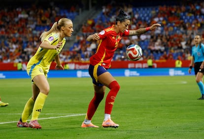 Jenni Hermoso controla el balón ayer en La Rosaleda ante Holmberg durante el partido entre España y Suecia.Marcelo del Pozo (REUTERS)
