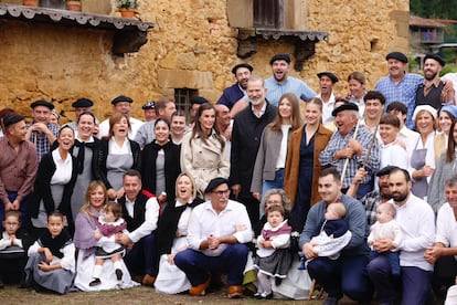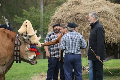 Los Reyes, la princesa Leonor y la infanta Sofía, junto a unos ganaderos en Valdesoto.Raúl Terrel (Europa Press)