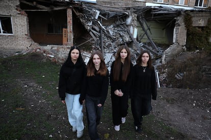 Cuatro adolescentes, delante de su colegio bombardeado en Kramatorsk: de izquierda a derecha son Carolina (13 años), Ksenia (13), Anastasia (15) y Katerina (14).Luis de Vega