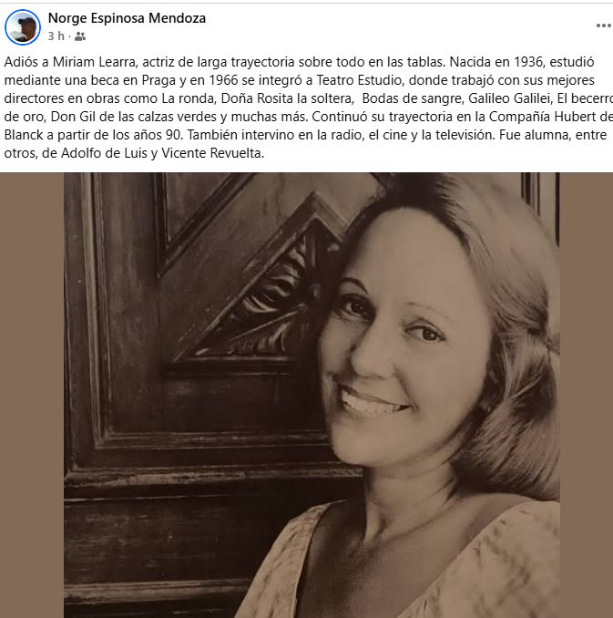 “Adiós a Miriam Learra, actriz de larga trayectoria sobre todo en las tablas. Nacida en 1936, estudió mediante una beca en Praga y en 1966 se integró a Teatro Estudio, donde trabajó con sus mejores directores en obras como La ronda, Doña Rosita la soltera, Bodas de sangre, Galileo Galilei, El becerro de oro, Don Gil de las calzas verdes y muchas más”, escribió en Facebook el dramaturgo Norge Espinosa.
