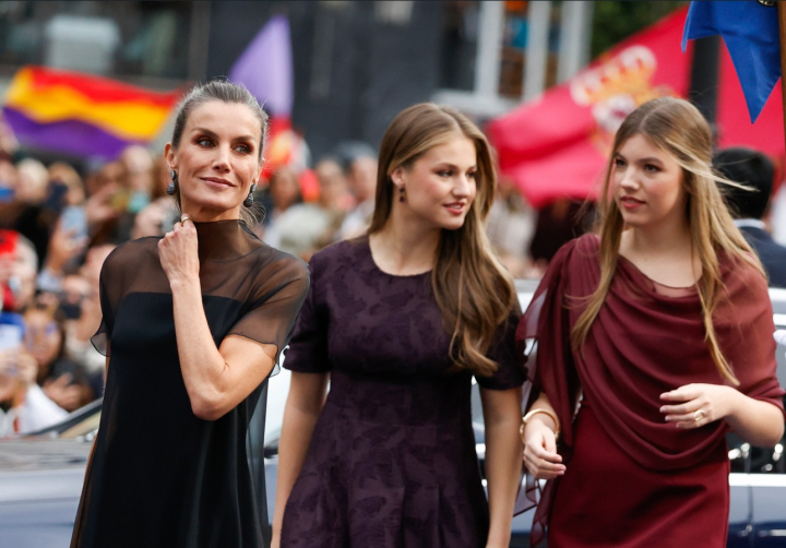 La reina Letizia, la princesa Leonor y la infanta Sofía, a su llegada al Teatro Campoamor, con una bandera republicana de fondo.GTRES