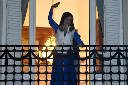 La expresidenta de Argentina Cristina Fernández de Kirchner saluda desde el balcón de su casa, donde cumple prisión domiciliaria.MATIAS MARTIN CAMPAYA (EFE)