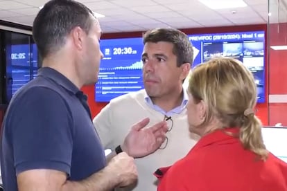 Captura de un vídeo de la reunión del Cecopi del 29 de octubre grabado por la productora contratada por Emergencias de la Generalitat, que recoge imágenes de las 20.30 horas (pantalla fondo) y se ve al president de la Generalitat Valenciana, Carlos Mazón (c) hablando con la consejera de Emergencias, Salomé Pradas, y el presidente de la Diputación de Valencia, Vicent Mompó.EFE