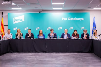 La dirección de Junts per Catalunya se ha reunido este lunes en Perpiñán (sur de Francia) para abordar un cambio profundo en las relaciones con el PSOE dos años después de firmar el acuerdo de investidura de Pedro Sánchez como presidente del Gobierno. Con muchos detalles todavía pendientes de concretar, la ejecutiva ha avalado “por unanimidad”, según fuentes del partido, la propuesta que ha hecho el líder de la formación, Carles Puigdemont, que básicamente supone romper el pacto de investidura por los “incumplimientos” que reprochan al PSOE. Los detalles se conocerán a partir de las cinco de la tarde en una conferencia de prensa desde Perpiñán. Lo que sí se sabe es que la militancia tendrá que ratificar la decisión de la cúpula en una consulta que se celebrará esta misma semana, probablemente el miércoles o el jueves.