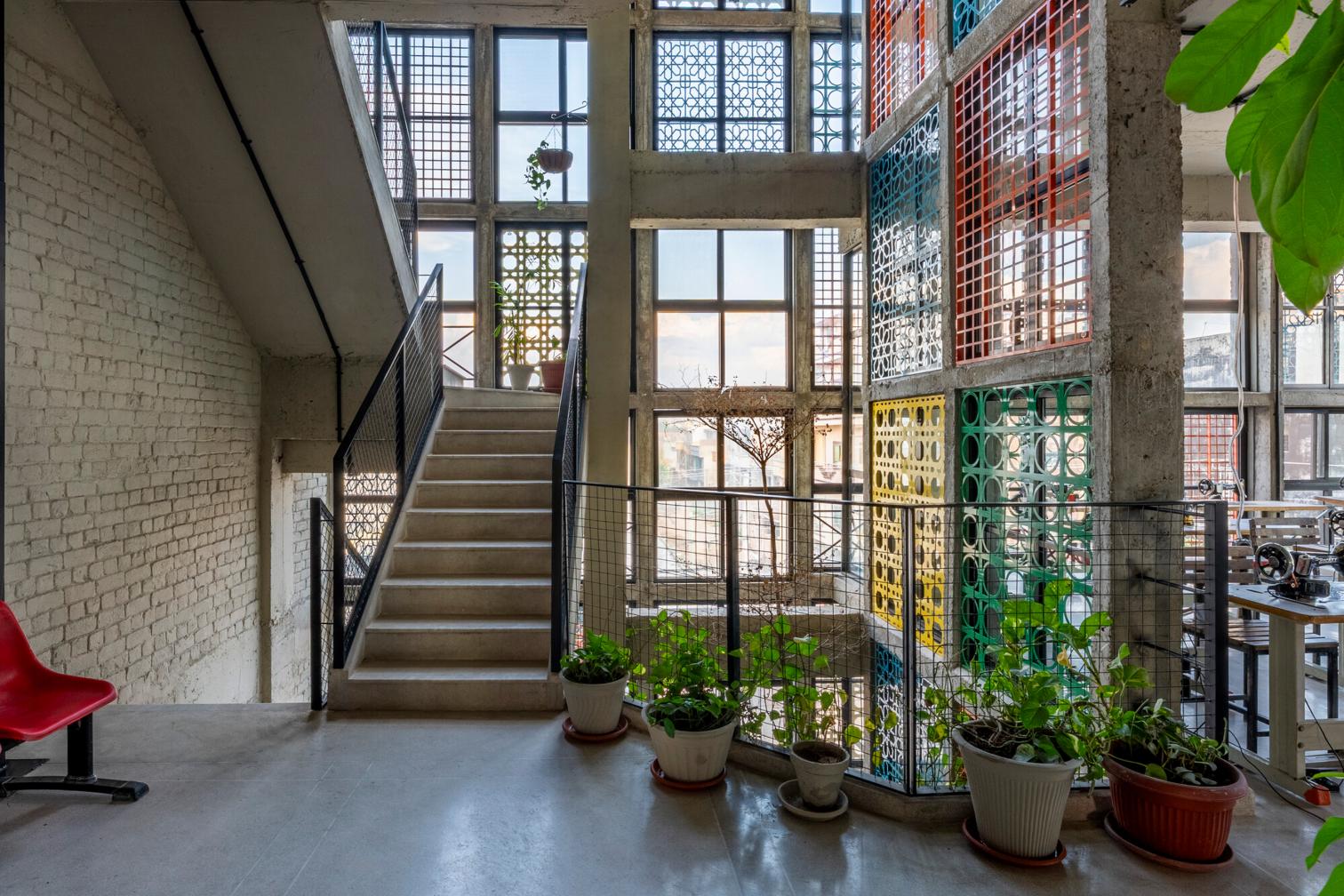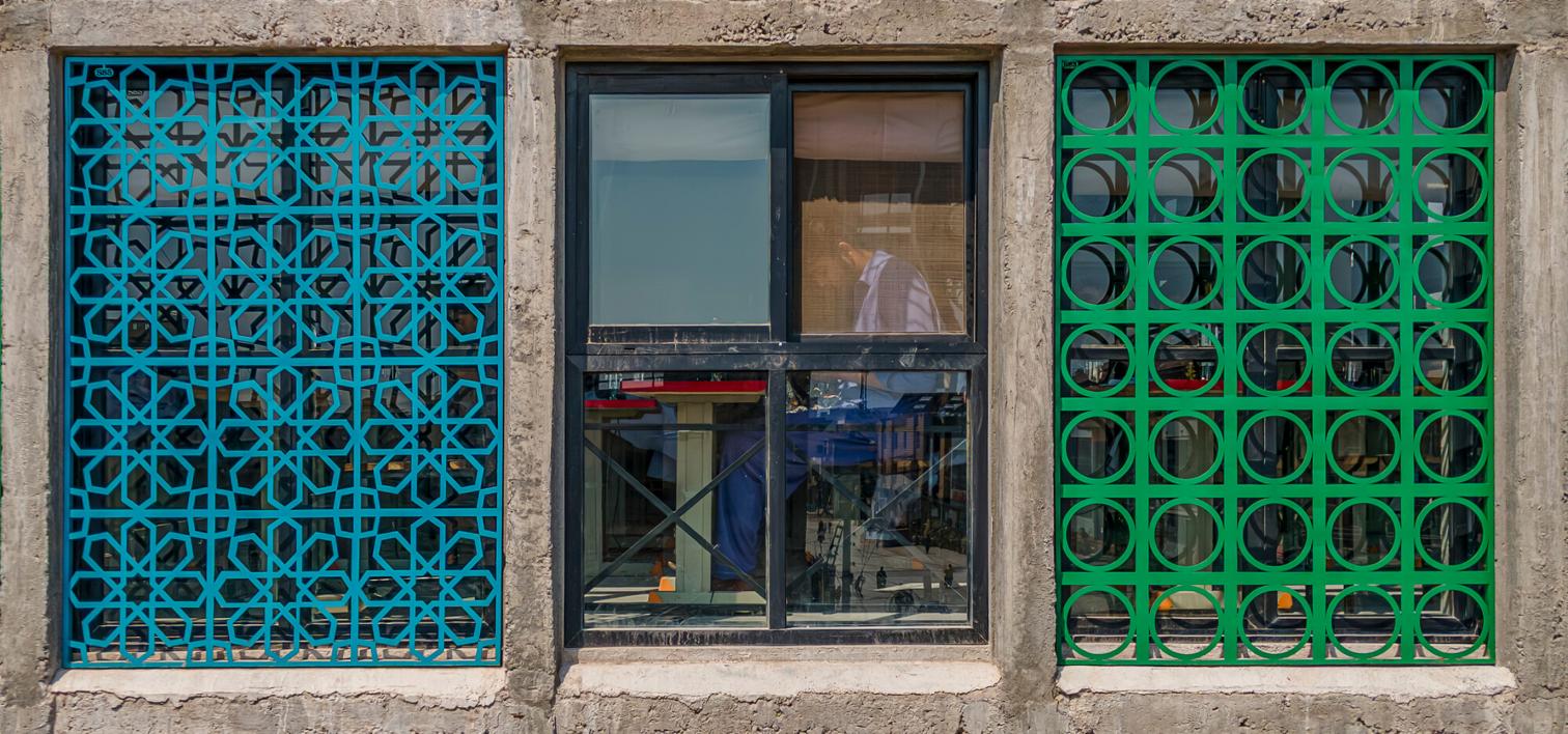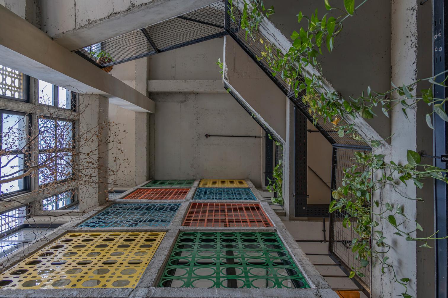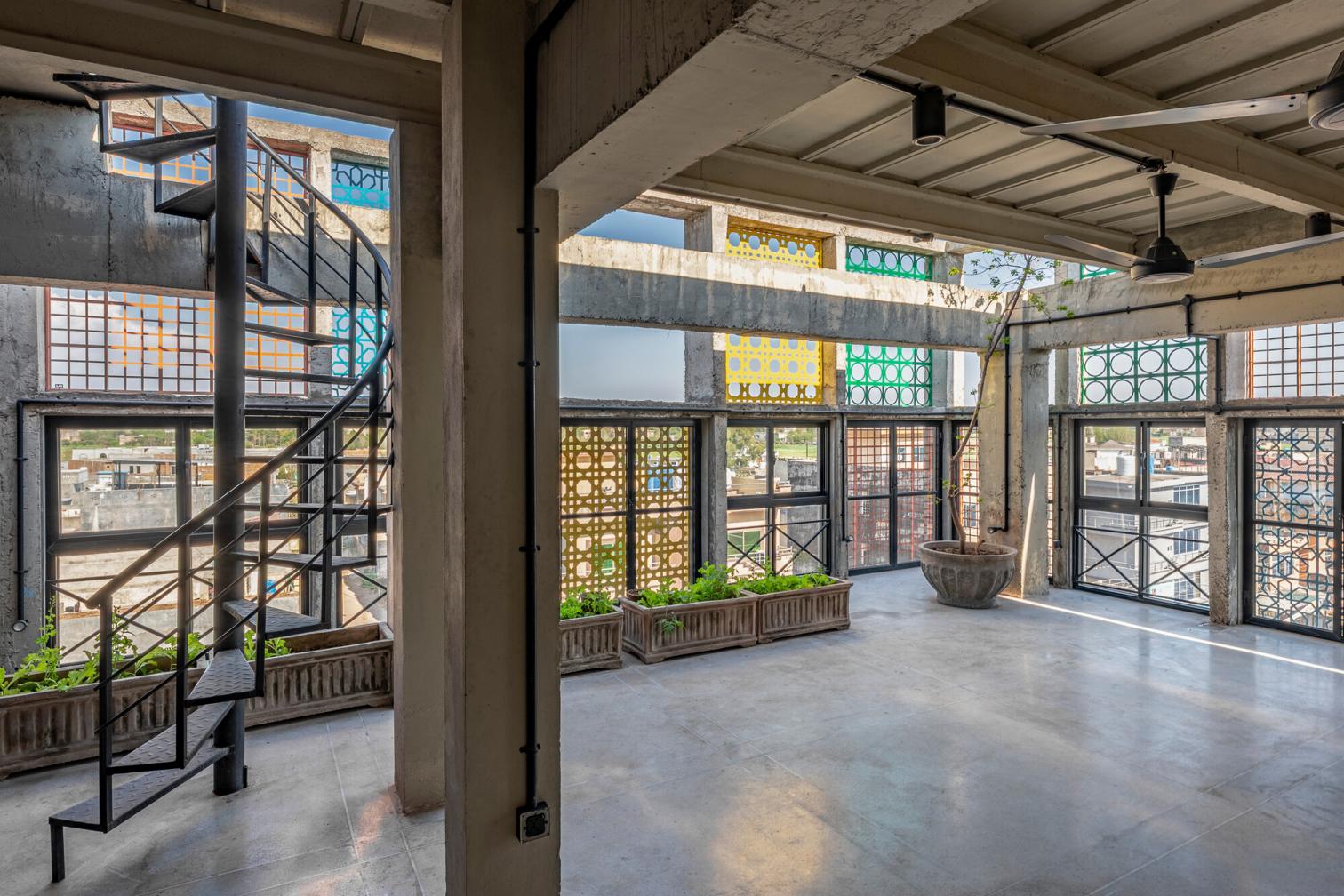 Los coloridos paneles metálicos perforados, conocidos como jaali, no solo protegen del sol y otorgan privacidad, sino que también introducen patrones geométricos inspirados en la artesanía pakistaní y árabe. Estos elementos rinden homenaje a la arquitectura de Islamabad de la década de 1960, reinterpretados con colores vivos, generando contraste con el hormigón visto.