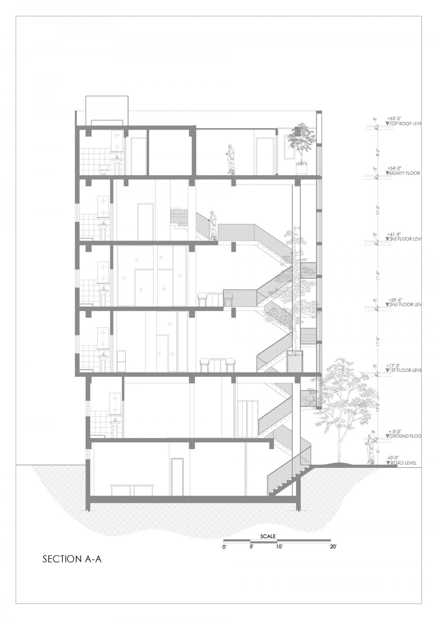 El edificio, situado en un barrio denso, combina tradición y funcionalidad contemporánea. Un atrio actúa como corazón del proyecto, facilitando la ventilación cruzada y la iluminación natural. A su alrededor se organizan aulas, zonas comunes, comedores, salas expositivas, alojamientos para el personal y, en la azotea, un espacio para la oración junto a un huerto cuidado por los propios estudiantes.
