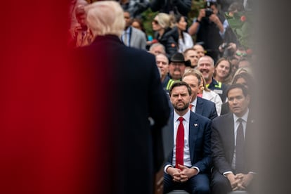 El vicepresidente JD Vance y el secretario de Estado Marco Rubio escuchan a Trump, durante un acto en el Jardín de las Rosas de la Casa Blanca, el 2 de abril.The Washington Post (The Washington Post via Getty Images)