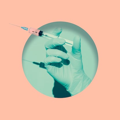Doctor’s hand holding syringe of Coronavirus vaccine placed inside round hole in pink paper.Digital composite»nFoto: Francesco Carta (Getty Images)