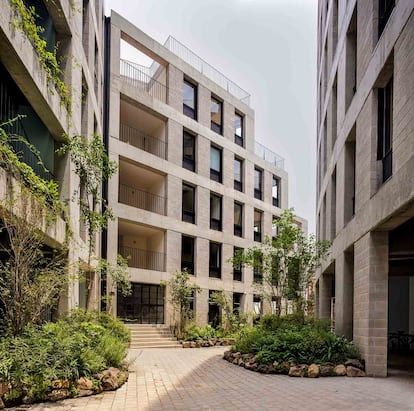 El arquitecto mexicano explica que esa es su forma de dignificar ese material tan presente en todo el país. Los apartamentos disfrutan de un patio en común, una calle peatonal interna que “por ahora las condiciones de seguridad de la ciudad no permiten que sea 100% pública”. Sin embargo, el inmueble está preparado. La configuración del edificio lo permitiría. El arquitecto explica que, por ahora, una reja que se esconde en un jardín, cierra el paso al patio interior. Pero quiere ser optimista: “Vencidas otras dificultades, querría soñar que algún día podremos quitar la reja que divide uno y otro y este espacio se incorpore a la ciudad”.